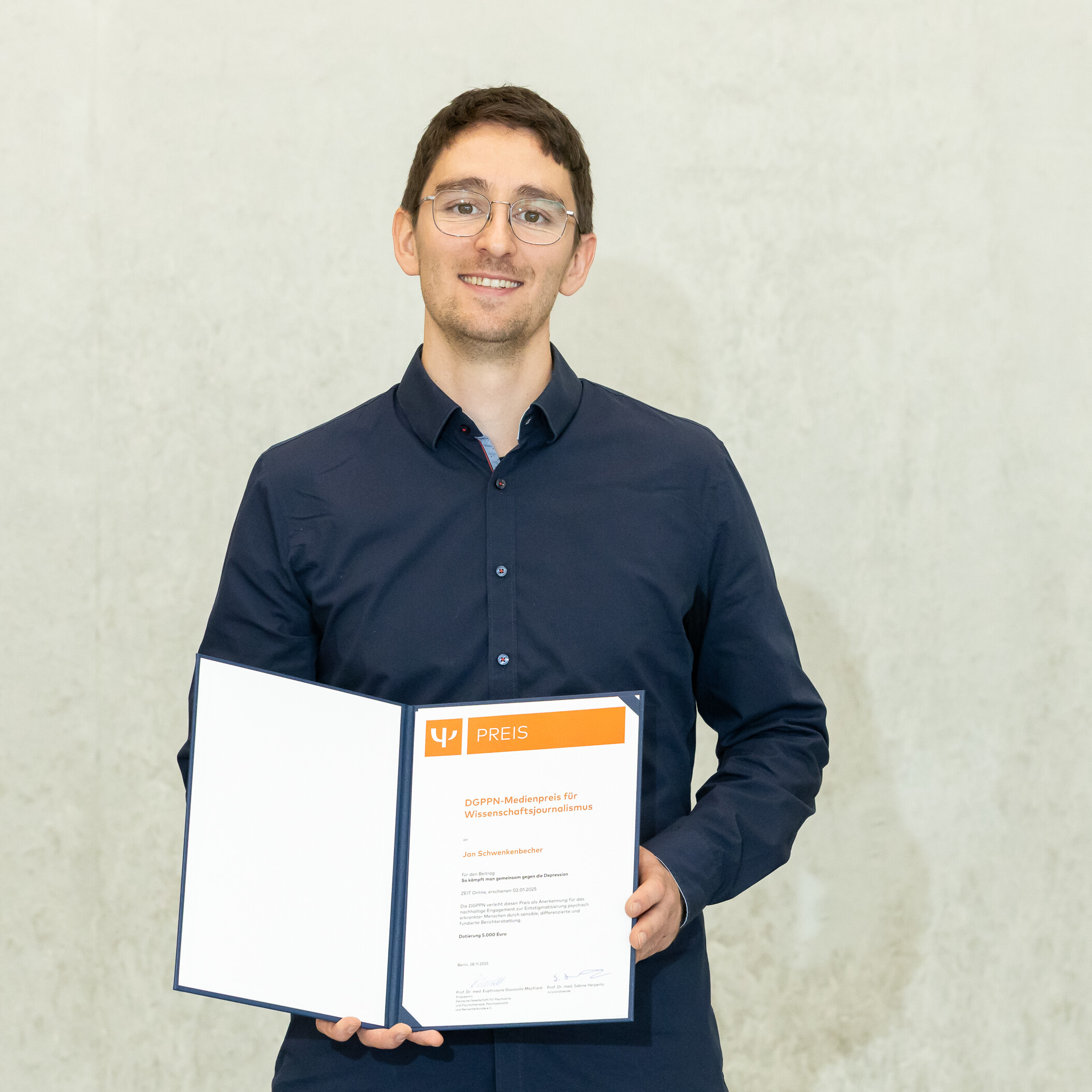 Jan Schwenkenbecher erhält die Auszeichnung für seinen Beitrag mit dem Titel "So kämpft man gemeinsam gegen die Depression".