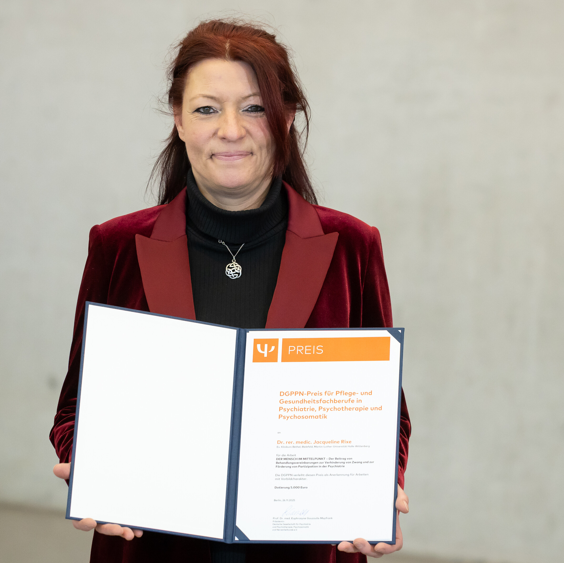 Mit dem Preis für Pflege- und Gesundheitsfachberufe in Psychiatrie, Psychotherapie und Psychosomatik würdigt die DGPPN zukunftsweisende Projekte, Modelle und wissenschaftliche Untersuchungen im Bereich der Pflege- und Gesundheitsfachberufe in der psychiatrischen Behandlung, sowohl im ambulanten als auch im stationären Umfeld. Besonders geschätzt werden Arbeiten, die die Weiterentwicklung der Praxis fördern und innovative berufsgruppenübergreifende Ansätze unterstützen.