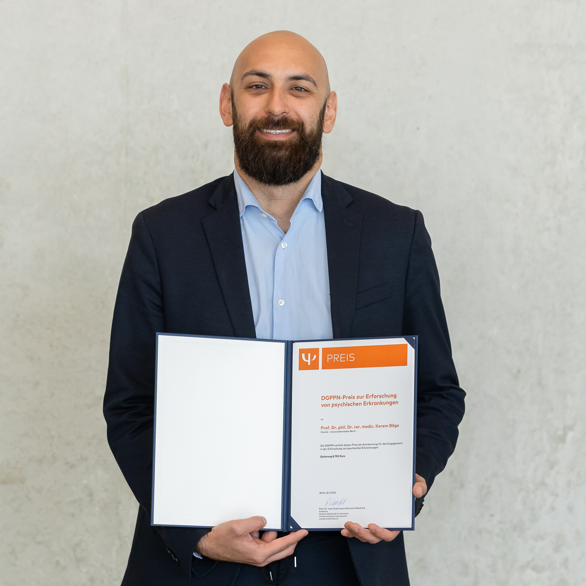Prof. Dr. Dr. Kerem Böge hat sich in den letzten Jahren als eine herausragende wissenschaftliche und klinische Persönlichkeit im Bereich der Interventionsforschung bei Psychosen und Menschen mit Flucht- oder Migrationserfahrung etabliert. Seine Arbeiten setzten weltweit Impulse für die psychische Gesundheitsversorgung dieser besonders vulnerablen Gruppen. Er gründete - neben doppelter Promotion, Habilitation und Approbation als Psychotherapeut - zwei soziale Start-Ups, die niedrigschwellige Behandlungsformen entwickeln und so den Transfer in die Versorgungspraxis ermöglichen. Herr Böge engagiert sich außerdem aktiv in der Nachwuchsförderung, in der konsequenten Einbindung von Betroffenen sowie der Wissenschaftskommunikation. Seine hochkarätige, innovative Forschung und sein hohes Engagement bereichern die moderne, patientenzentrierte Psychiatrie und Psychotherapie.