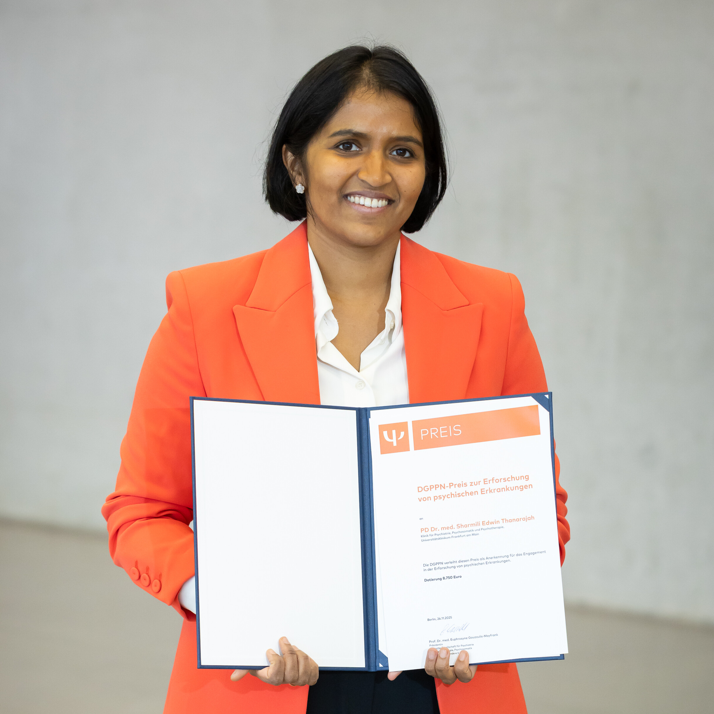 PD Dr. Sharmili Edwin Thanarajahs zählt zu den führenden Wissenschaftlerinnen im aufstrebenden Feld der Metabolischen Psychiatrie. Mithilfe intelligenter, experimenteller Paradigmen gelingt es ihr, die komplexen Interaktionen zwischen metabolischen, immunologischen und neurologischen Prozessen in der Psychiatrie nachhaltig besser zu verstehen. Ihre interdisziplinäre Forschung zeugt von einer beachtenswerten Methodenvielfalt. Hochengagiert setzt sie sich dafür ein, das noch junge Forschungsfeld in der Psychiatrie zu etablieren. Ihr Engagement als Mitbegründerin des neuen DGPPN-Referats Ernährung, Stoffwechsel und Psychische Gesundheit ist in diesem Zusammenhang besonders herauszustellen. Damit leistet sie einen bedeutenden Beitrag für die Weiterentwicklung des Fachs und die Translation neuer Erkenntnisse in die praktische Versorgung.