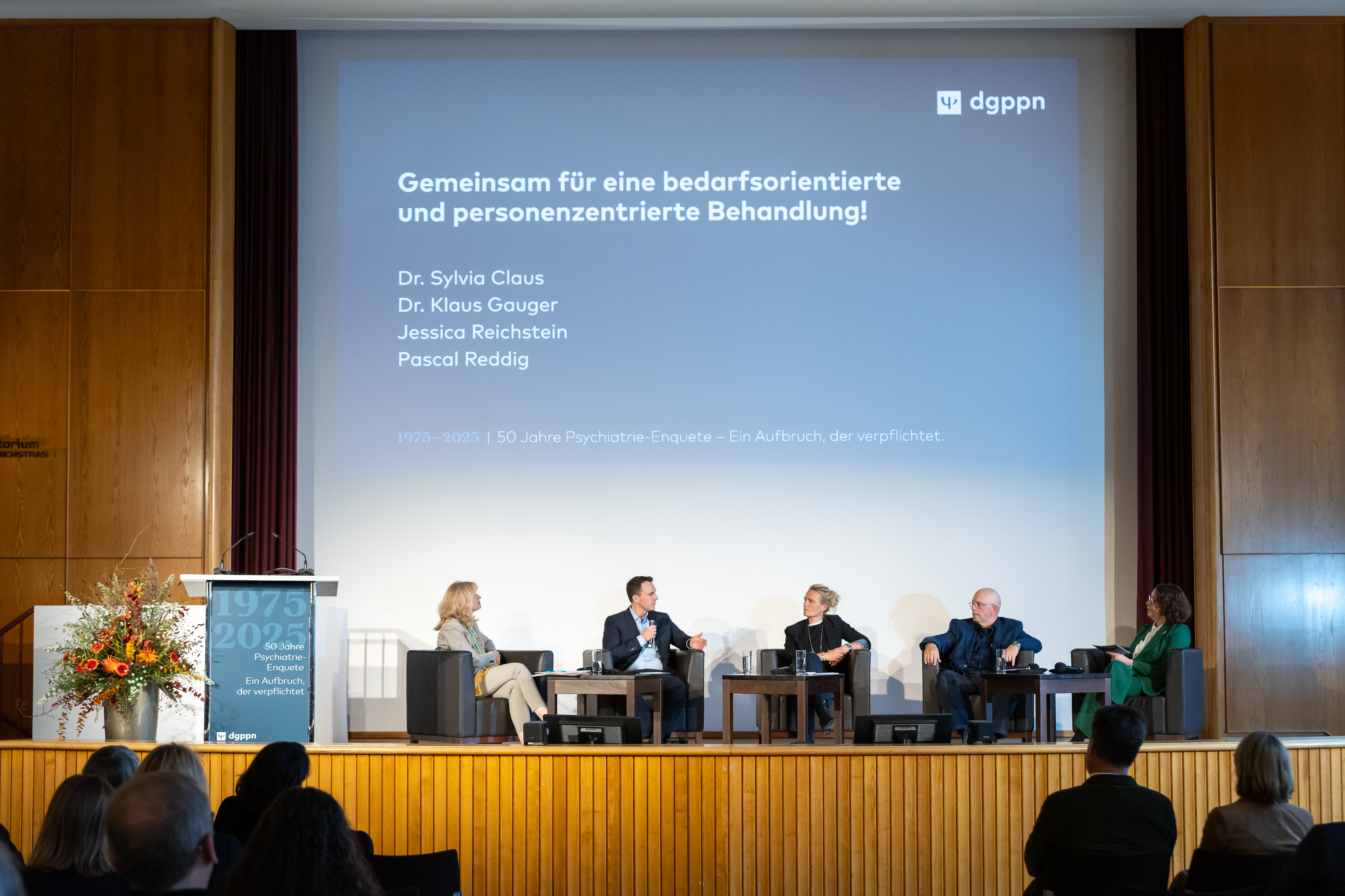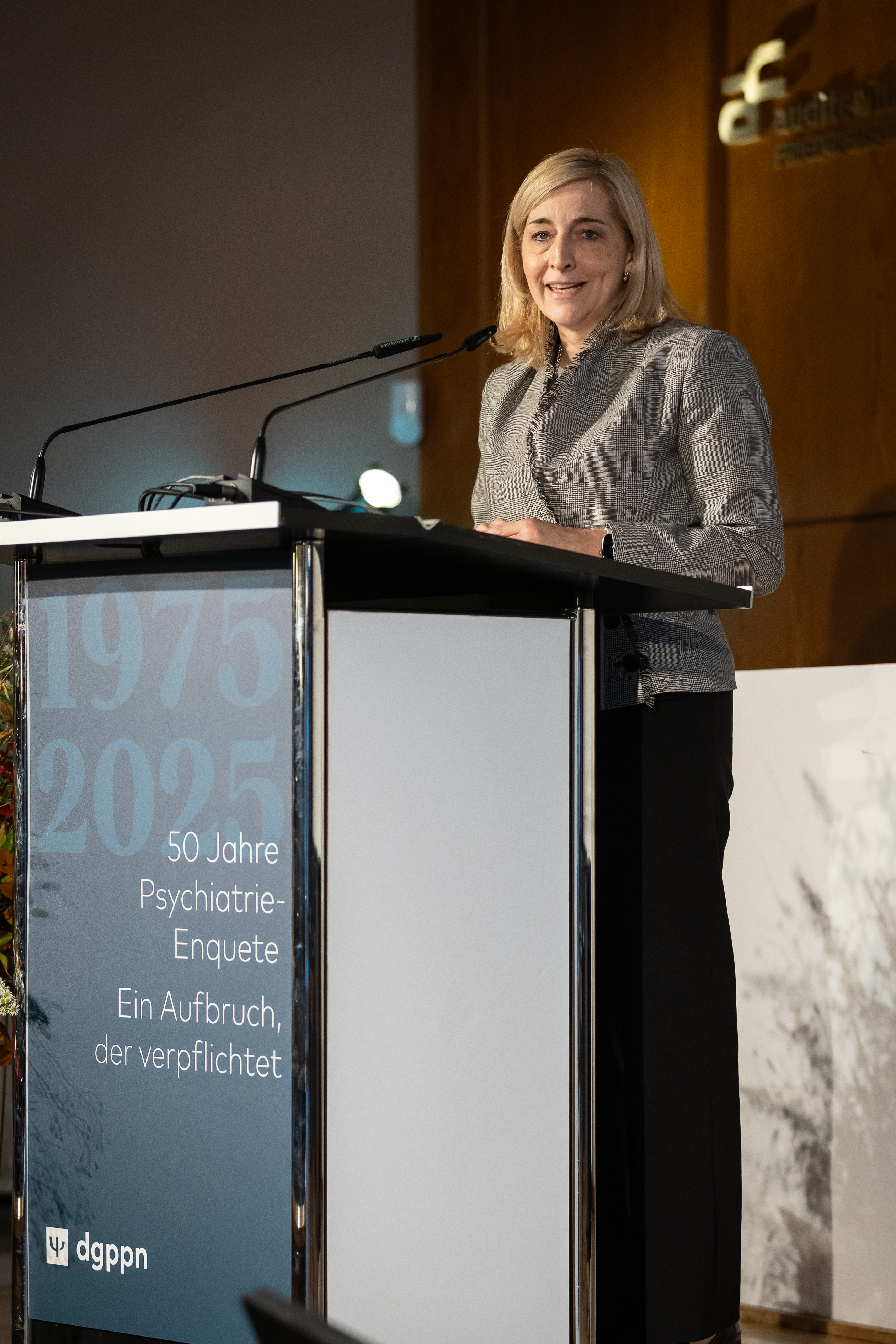 Bundesgesundheitsministerin Nina Warken betonte in ihrem Grußwort die Bedeutung der Enquete als Wendepunkt in der deutschen Psychiatrie. Prof. Dr. Euphrosyne Gouzoulis-Mayfrank, Präsidentin der DGPPN, führte aus: „Die Psychiatrie-Enquete leitete den Übergang ein, von der Verwahrpsychiatrie hin zu einer Psychiatrie, die die Bedürfnisse der Patientinnen und Patienten in den Fokus nimmt. Es ist unsere Verantwortung, die Vision der Enquete weiterzuführen und sicherzustellen, dass alle Menschen die für sie bestmögliche Behandlung erhalten.“